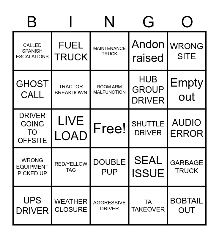 This bingo card has a free space and 29 words: UPS DRIVER, LIVE UNLOAD, LIVE LOAD, CALLED ESCALATIONS, CALLED SPANISH ESCALATIONS, MAINTENANCE TRUCK, TRACTOR BREAKDOWN, RED/YELLOW TAG, SHUTTLE DRIVER, WEATHER CLOSURE, AUDIO ERROR, BOBTAIL OUT, AGGRESSIVE DRIVER, TA TAKEOVER, Empty out, Problem solved, DOUBLE PUP, WRONG EQUIPMENT PICKED UP, WRONG SITE, DRIVER GOING TO OFFSITE, SEAL ISSUE, JBHU DRIVER, HUB GROUP DRIVER, GHOST CALL, Andon raised, FUEL TRUCK, GARBAGE TRUCK, BOOM ARM MALFUNCTION and REJECTED DRIVER.