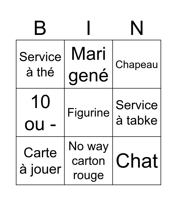 This bingo card has a free space and 8 words: Service à tabke, Chapeau, Mari gené, Carte à jouer, Service à thé, Chat, 10 ou - and No way carton rouge.