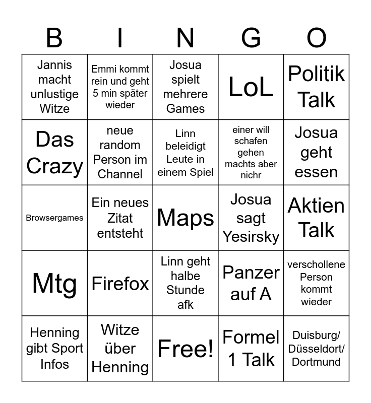 This bingo card has a free space and 24 words: Firefox, Witze über Henning, Linn beleidigt Leute in einem Spiel, Henning gibt Sport Infos, Politik Talk, Jannis macht unlustige Witze, Das Crazy, Emmi kommt rein und geht 5 min später wieder, Josua sagt Yesirsky, Linn geht halbe Stunde afk, einer will schafen gehen machts aber nichr, Browsergames, Panzer auf A, verschollene Person kommt wieder, neue random Person im Channel, Formel 1 Talk, Aktien Talk, Josua spielt mehrere Games, Josua geht essen, Ein neues Zitat entsteht, Duisburg/ Düsseldort/ Dortmund, Mtg, LoL and Free!.