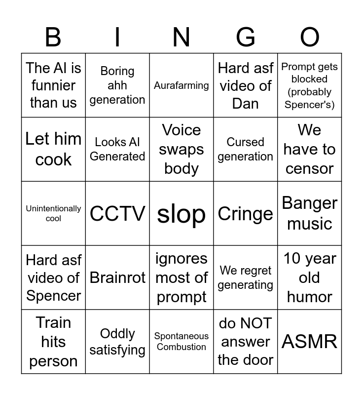 This bingo card has a free space and 24 words: Brainrot, Oddly satisfying, Voice swaps body, Train hits person, Prompt gets blocked (probably Spencer's), The AI is funnier than us, Let him cook, Boring ahh generation, Cringe, ignores most of prompt, Cursed generation, Unintentionally cool, We regret generating, 10 year old humor, Looks AI Generated, do NOT answer the door, Banger music, Aurafarming, We have to censor, CCTV, ASMR, Hard asf video of Spencer, Hard asf video of Dan and Spontaneous Combustion.