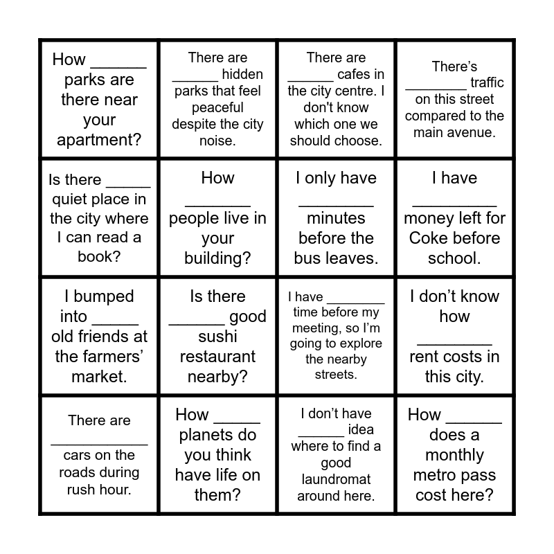 This bingo card has 16 words: How _____ planets do you think have life on them?, I don’t know how ________ rent costs in this city., There are ______ cafes in the city centre. I don't know which one we should choose., How ______ parks are there near your apartment?, I bumped into _____ old friends at the farmers’ market., There are ______ hidden parks that feel peaceful despite the city noise., I have ________ time before my meeting, so I’m going to explore the nearby streets., I don’t have ______ idea where to find a good laundromat around here., Is there _____ quiet place in the city where I can read a book?, How _______ people live in your building?, There are ____________ cars on the roads during rush hour., There’s ________ traffic on this street compared to the main avenue., Is there ______ good sushi restaurant nearby?, I have _________ money left for Coke before school., I only have ________ minutes before the bus leaves. and How ______ does a monthly metro pass cost here?.