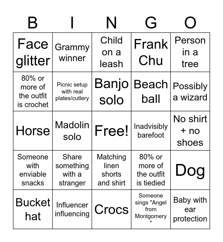 This bingo card has a free space and 39 words: Thinly veiled political commentary, Blunt political commentary, Suprise musical guest, Picnic setup with real plates/cutlery, Bucket hat, Matching linen shorts and shirt, Banjo solo, Fiddle solo, Person in a tree, Someone with enviable snacks, Madolin solo, Frank Chu, Baby with ear protection, No shirt + no shoes, Inadvisibly barefoot, Share something with a stranger, Compliment a stranger, Face glitter, Backpack beer merchant, 80% or more of the outfit is tiedied, 80% or more of the outfit is crochet, Crocs, Beach ball, Possibly a wizard, Fleece vest w/tech co. logo, Crust punk, Someone selling jewlery from a blanket, "Make some noise", Accordion, Grammy winner, Tee shirt of musican playing, Red tailed hawk, Child on a leash, Influencer influencing, Someone sings "Angel from Montgomery ", Singing in a language other than English, Dog, Horse and Weeeeeeeed.