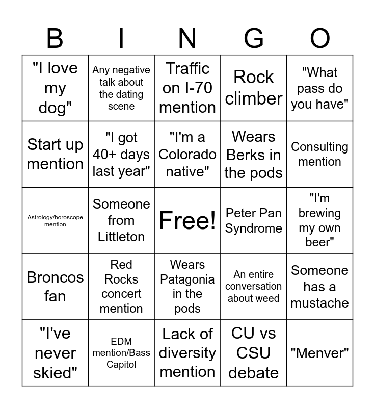 This bingo card has a free space and 24 words: Red Rocks concert mention, EDM mention/Bass Capitol, "I'm a Colorado native", "I've never skied", "What pass do you have", "I love my dog", Start up mention, Any negative talk about the dating scene, Peter Pan Syndrome, Wears Patagonia in the pods, Wears Berks in the pods, Astrology/horoscope mention, An entire conversation about weed, Someone has a mustache, "I got 40+ days last year", CU vs CSU debate, "I'm brewing my own beer", Traffic on I-70 mention, Consulting mention, Someone from Littleton, "Menver", Broncos fan, Rock climber and Lack of diversity mention.