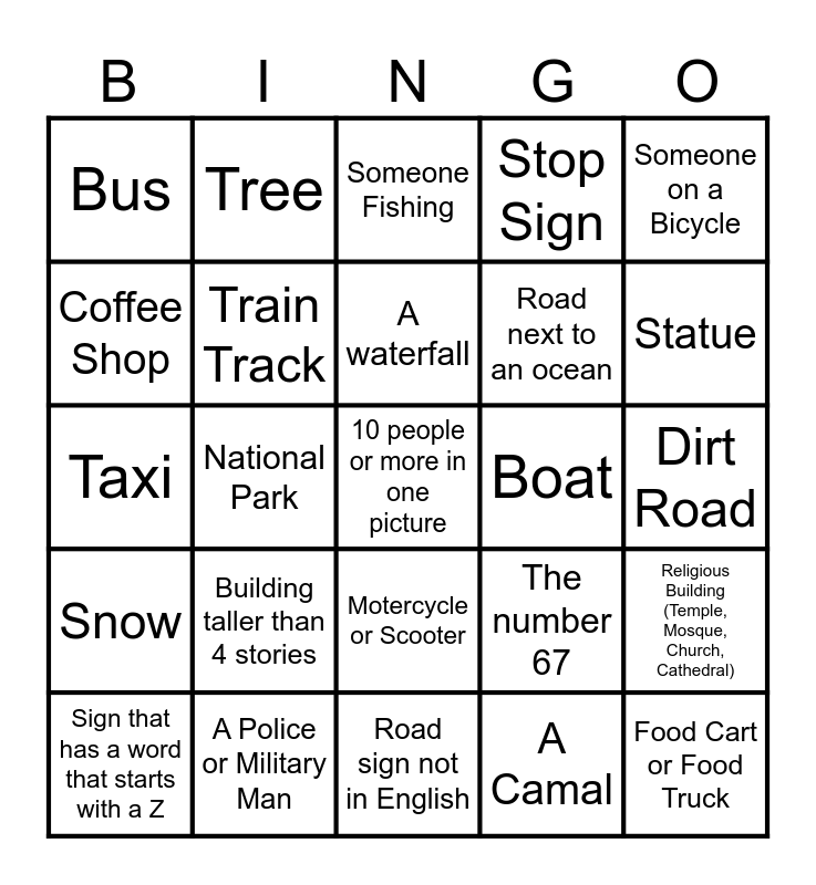 This bingo card has 25 words: Building taller than 4 stories, Road sign not in English, A waterfall, Sign that has a word that starts with a Z, Someone on a Bicycle, Bus, Coffee Shop, Tree, Boat, Motercycle or Scooter, Road next to an ocean, Taxi, The number 67, Religious Building (Temple, Mosque, Church, Cathedral), Train Track, Food Cart or Food Truck, Dirt Road, Someone Fishing, Statue, National Park, 10 people or more in one picture, A Police or Military Man, Snow, Stop Sign and A Camal.