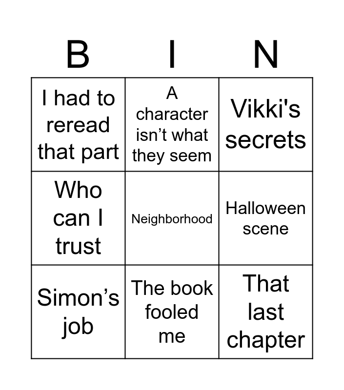 This bingo card has 22 words: Free!, I didn’t see that coming!, A character isn’t what they seem, Money as a motive, Halloween scene, Simon’s job, I had to reread that part, Vikki's secrets, Clue hidden in plain sight, Police work, That last chapter, Who can I trust, Who is the real villain, Manipulation or deception, Timeline jump, Favorite minor character, Book’s structure, Betrayal, Made into a movie, Neighborhood, The book fooled me and Favorite twist.