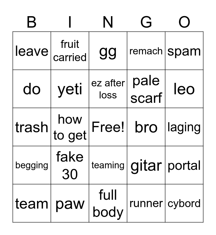 This bingo card has a free space and 24 words: team, fake 30, ez after loss, runner, spam, leave, fruit carried, gg, bro, laging, trash, yeti, gitar, portal, do, paw, full body, remach, leo, begging, how to get, teaming, pale scarf and cybord.