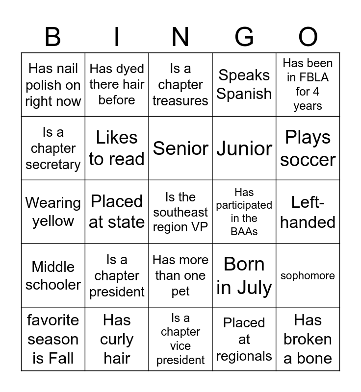 This bingo card has a free space and 24 words: Is a chapter president, Has curly hair, Senior, favorite season is Fall, Has been in FBLA for 4 years, Has nail polish on right now, Is a chapter secretary, Has dyed there hair before, Has participated in the BAAs, Has more than one pet, Junior, Wearing yellow, Born in July, sophomore, Likes to read, Placed at regionals, Left-handed, Is a chapter treasures, Plays soccer, Placed at state, Has broken a bone, Middle schooler, Speaks Spanish and Is a chapter vice president.