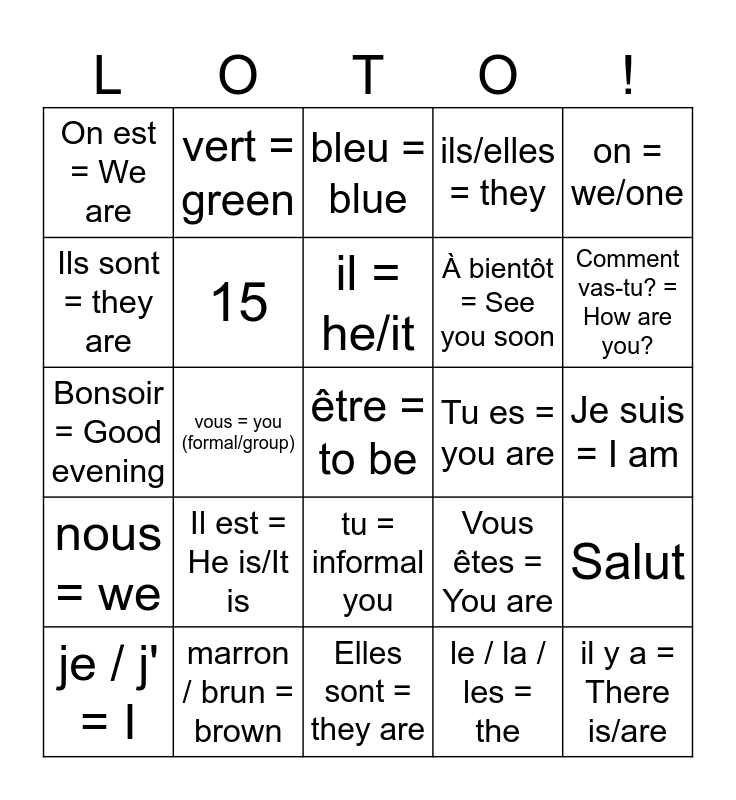 This bingo card has a free space and 39 words: Comment vous appelez-vous ?, Comment t'appelles-tu ?, Comment allez-vous ? = How are you?, 15, je / j' = I, tu = informal you, il = he/it, elle = she/it, on = we/one, nous = we, vous = you (formal/group), ils/elles = they, il y a = There is/are, Je suis = I am, Tu es = you are, Il est = He is/It is, Elle est = She is/It is, On est = We are, Nous sommes = We are, Vous êtes = You are, Ils sont = they are, Elles sont = they are, À bientôt = See you soon, Comment vas-tu? = How are you?, Ça va bien. = I am well., Ça va mal., un / une = a/an, des = some, Ça va ? = How are you?, vert = green, blanc = white, rouge = red, bleu = blue, marron / brun = brown, le / la / les = the, Au revoir, Salut, Bonsoir = Good evening and Qu'est-ce que = what.