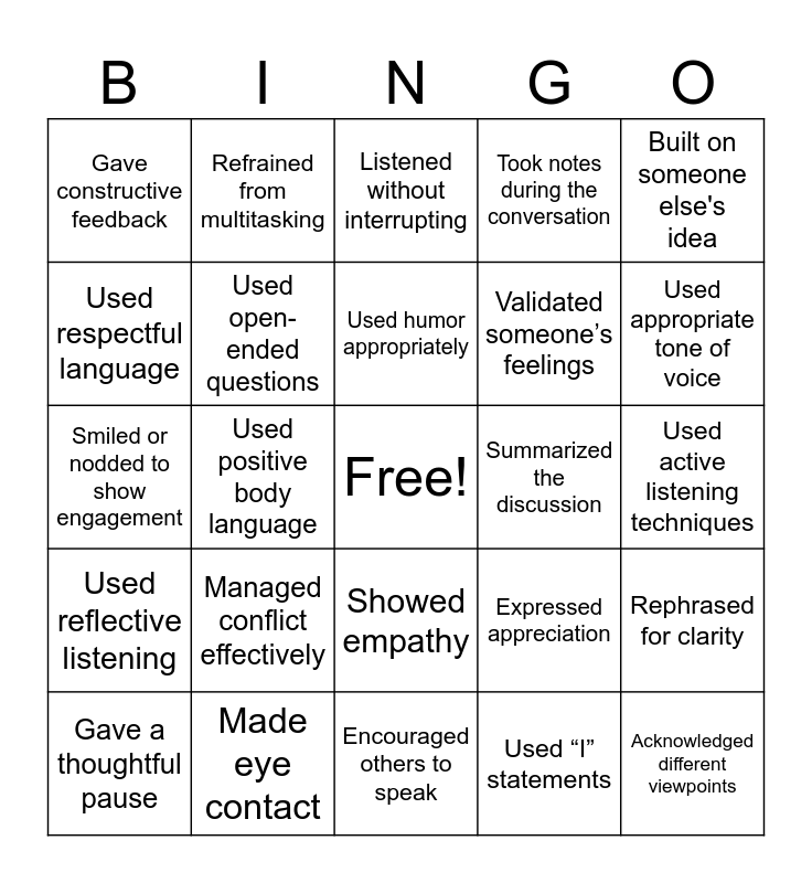 This bingo card has a free space and 30 words: Made eye contact, Asked a clarifying question, Used positive body language, Paraphrased someone's point, Gave constructive feedback, Listened without interrupting, Used open-ended questions, Showed empathy, Summarized the discussion, Encouraged others to speak, Used active listening techniques, Acknowledged different viewpoints, Used “I” statements, Stayed on topic, Used appropriate tone of voice, Asked for feedback, Expressed appreciation, Used reflective listening, Managed conflict effectively, Built on someone else's idea, Smiled or nodded to show engagement, Waited before responding, Refrained from multitasking, Validated someone’s feelings, Used respectful language, Took notes during the conversation, Rephrased for clarity, Gave a thoughtful pause, Used humor appropriately and Closed the conversation with kindness.