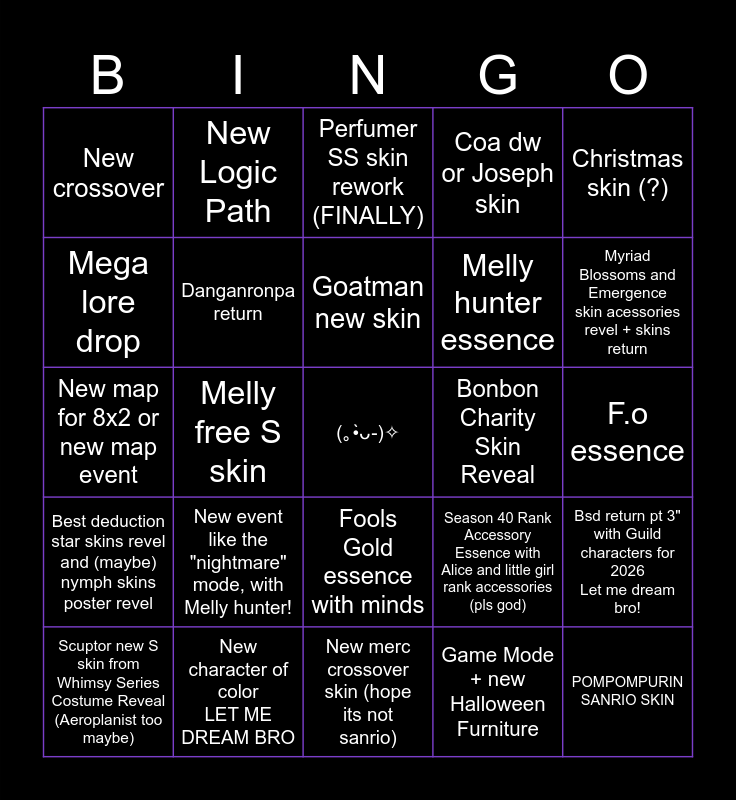 This bingo card has a free space and 24 words: New event like the "nightmare" mode, with Melly hunter!, New character of color LET ME DREAM BRO, Goatman new skin, Scuptor new S skin from Whimsy Series Costume Reveal (Aeroplanist too maybe), Christmas skin (?), New crossover, Mega lore drop, New Logic Path, Bonbon Charity Skin Reveal, Fools Gold essence with minds, Melly hunter essence, New map for 8x2 or new map event, Season 40 Rank Accessory Essence with Alice and little girl rank accessories (pls god), Bsd return pt 3" with Guild characters for 2026 Let me dream bro!, Danganronpa return, Game Mode + new Halloween Furniture, F.o essence, Perfumer SS skin rework (FINALLY), Myriad Blossoms and Emergence skin acessories revel + skins return, Melly free S skin, POMPOMPURIN SANRIO SKIN, Best deduction star skins revel and (maybe) nymph skins poster revel, Coa dw or Joseph skin and New merc crossover skin (hope its not sanrio).