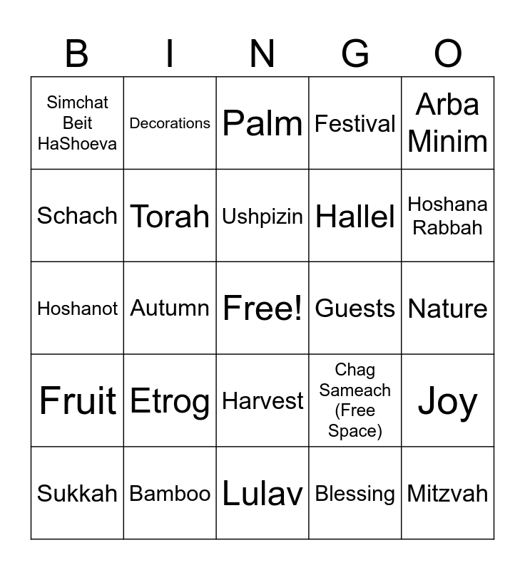 This bingo card has a free space and 25 words: Etrog, Lulav, Ushpizin, Sukkah, Arba Minim, Simchat Beit HaShoeva, Schach, Decorations, Guests, Harvest, Hallel, Hoshanot, Chag Sameach (Free Space), Joy, Torah, Feast, Nature, Palm, Hoshana Rabbah, Autumn, Mitzvah, Bamboo, Fruit, Festival and Blessing.