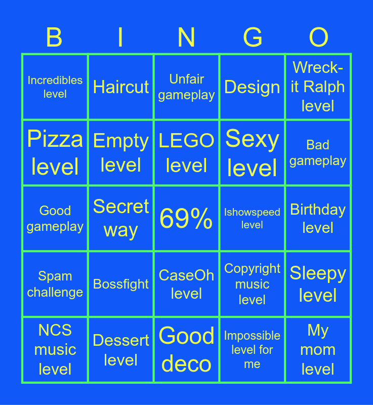 This bingo card has a free space and 24 words: Bossfight, Dessert level, LEGO level, NCS music level, Wreck-it Ralph level, Incredibles level, Pizza level, Haircut, Ishowspeed level, CaseOh level, Sexy level, Good gameplay, Copyright music level, Sleepy level, Empty level, Impossible level for me, Birthday level, Unfair gameplay, Bad gameplay, Secret way, My mom level, Spam challenge, Design and Good deco.