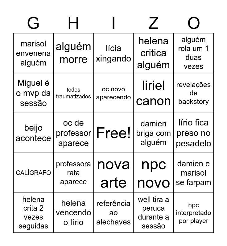 This bingo card has a free space and 24 words: professora rafa aparece, helena vencendo o lírio, oc novo aparecendo, helena crita 2 vezes seguidas, alguém rola um 1 duas vezes, marisol envenena alguém, Miguel é o mvp da sessão, alguém morre, damien briga com alguém, nova arte, liriel canon, beijo acontece, npc novo, damien e marisol se farpam, todos traumatizados, well tira a peruca durante a sessão, lírio fica preso no pesadelo, lícia xingando, revelações de backstory, oc de professor aparece, npc interpretado por player, CALÍGRAFO, helena critica alguém and referência ao alechaves.