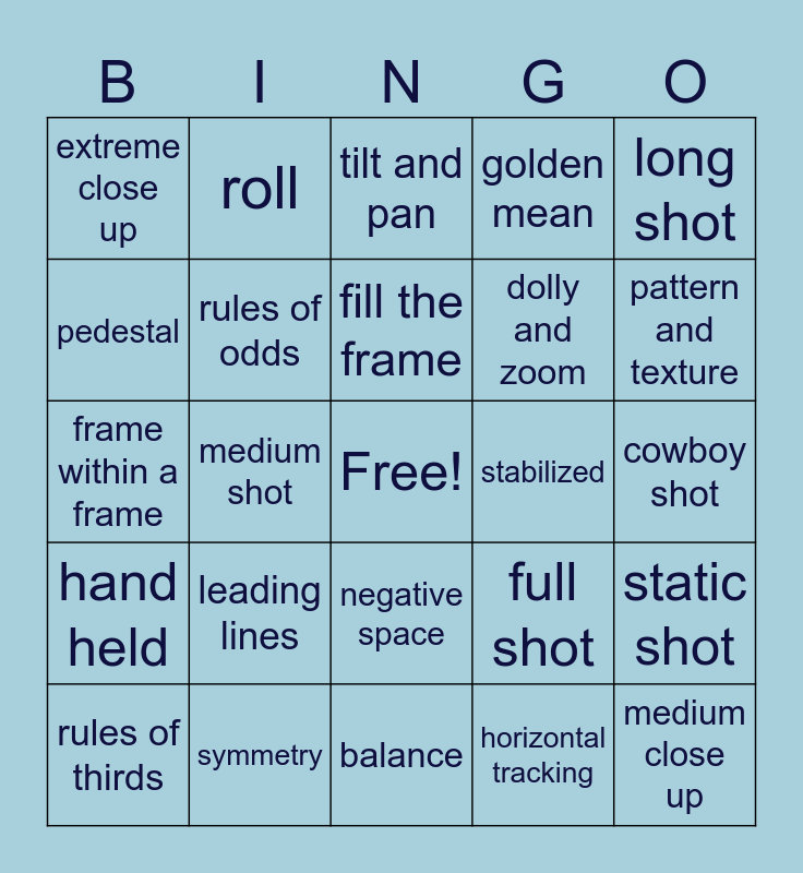 This bingo card has a free space and 28 words: static shot, dolly, dolly and zoom, horizontal tracking, pedestal, tilt and pan, roll, hand held, stabilized, rules of thirds, frame within a frame, golden mean, symmetry, balance, pattern and texture, foreground depth, leading lines, rules of odds, fill the frame, negative space, extreme close up, close up, medium close up, medium shot, cowboy shot, full shot, long shot and extreme long shot.