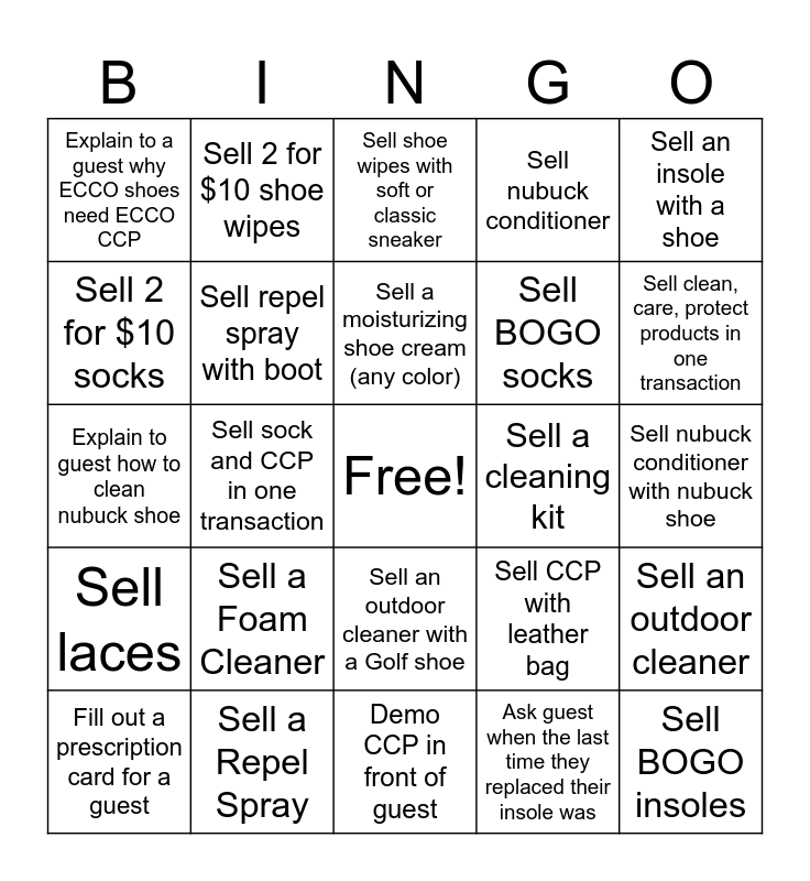 This bingo card has a free space and 24 words: Sell a Foam Cleaner, Sell a Repel Spray, Sell a moisturizing shoe cream (any color), Fill out a prescription card for a guest, Sell an insole with a shoe, Explain to a guest why ECCO shoes need ECCO CCP, Sell 2 for $10 socks, Sell 2 for $10 shoe wipes, Sell a cleaning kit, Sell an outdoor cleaner with a Golf shoe, Sell BOGO socks, Explain to guest how to clean nubuck shoe, Sell CCP with leather bag, Sell an outdoor cleaner, Sell repel spray with boot, Ask guest when the last time they replaced their insole was, Sell nubuck conditioner with nubuck shoe, Sell shoe wipes with soft or classic sneaker, Sell clean, care, protect products in one transaction, Sell sock and CCP in one transaction, Sell BOGO insoles, Sell laces, Sell nubuck conditioner and Demo CCP in front of guest.