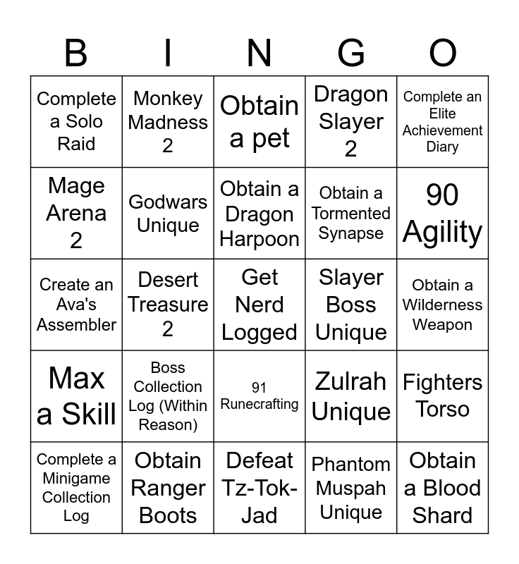 This bingo card has a free space and 24 words: Complete a Minigame Collection Log, Boss Collection Log (Within Reason), Obtain a Dragon Harpoon, Phantom Muspah Unique, Complete an Elite Achievement Diary, Complete a Solo Raid, Monkey Madness 2, Obtain a pet, Slayer Boss Unique, Obtain a Wilderness Weapon, Create an Ava's Assembler, Godwars Unique, Zulrah Unique, Fighters Torso, Mage Arena 2, Obtain Ranger Boots, Defeat Tz-Tok-Jad, Dragon Slayer 2, 90 Agility, Max a Skill, Desert Treasure 2, 91 Runecrafting, Obtain a Tormented Synapse and Obtain a Blood Shard.
