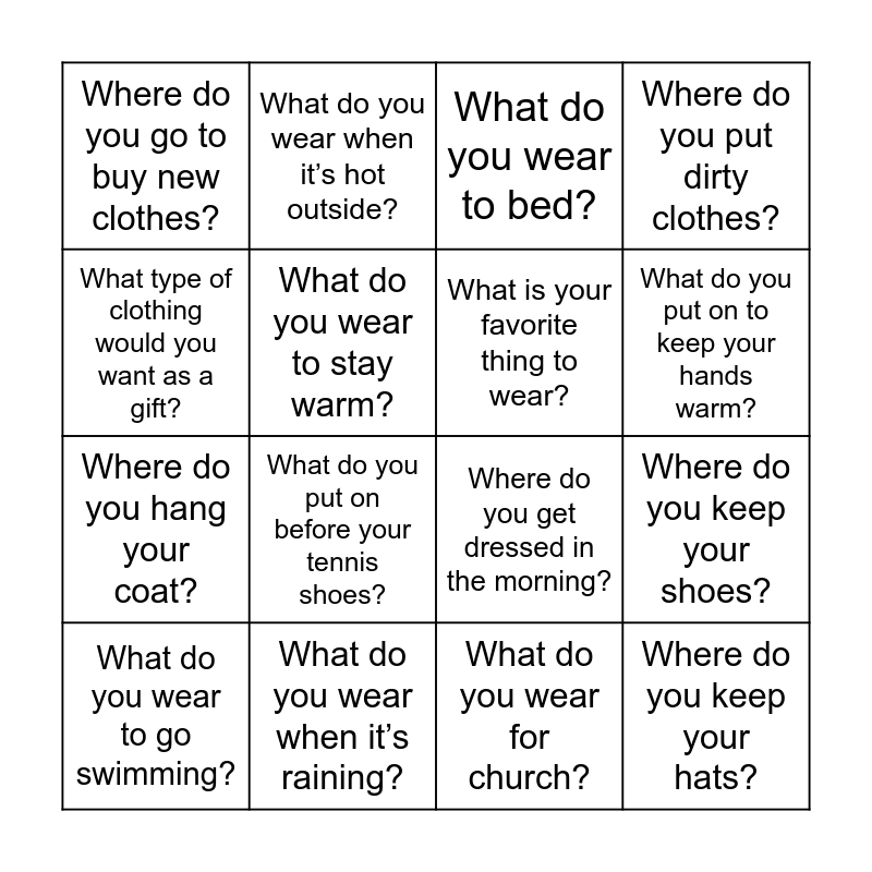 This bingo card has 16 words: What do you wear when it’s raining?, Where do you keep your shoes?, What do you wear to bed?, Where do you go to buy new clothes?, Where do you hang your coat?, What do you wear when it’s hot outside?, Where do you get dressed in the morning?, What do you wear for church?, What type of clothing would you want as a gift?, What do you wear to stay warm?, What do you wear to go swimming?, Where do you put dirty clothes?, What do you put on before your tennis shoes?, What do you put on to keep your hands warm?, What is your favorite thing to wear? and Where do you keep your hats?.
