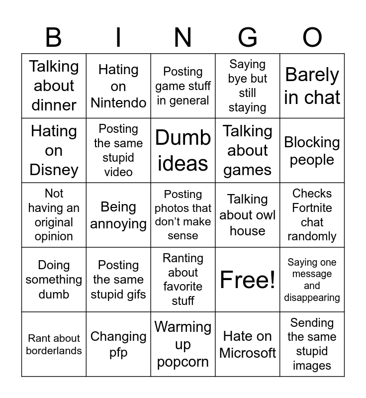This bingo card has 25 words: Posting the same stupid gifs, Warming up popcorn, Dumb ideas, Rant about borderlands, Barely in chat, Talking about dinner, Hating on Disney, Hating on Nintendo, Talking about owl house, Ranting about favorite stuff, Talking about games, Not having an original opinion, Free!, Saying one message and disappearing, Posting the same stupid video, Sending the same stupid images, Checks Fortnite chat randomly, Posting game stuff in general, Blocking people, Being annoying, Posting photos that don’t make sense, Changing pfp, Doing something dumb, Saying bye but still staying and Hate on Microsoft.