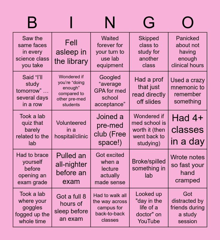 This bingo card has a free space and 24 words: Pulled an all-nighter before an exam, Got a full 8 hours of sleep before an exam, Googled “average GPA for med school acceptance”, Took a lab where your goggles fogged up the whole time, Panicked about not having enough clinical hours, Saw the same faces in every science class you take, Said “I’ll study tomorrow” … several days in a row, Fell asleep in the library, Wondered if med school is worth it (then went back to studying), Got excited when a lecture actually made sense, Had a prof that just read directly off slides, Took a lab quiz that barely related to the lab, Broke/spilled something in lab, Wrote notes so fast your hand cramped, Wondered if you’re “doing enough” compared to other pre-med students, Looked up "day in the life of a doctor" on YouTube, Had 4+ classes in a day, Waited forever for your turn to use lab equipment, Used a crazy mnemonic to remember something, Volunteered in a hospital/clinic, Got distracted by friends during a study session, Had to brace yourself before opening an exam grade, Skipped class to study for another class and Had to walk all the way across campus for back-to-back classes.