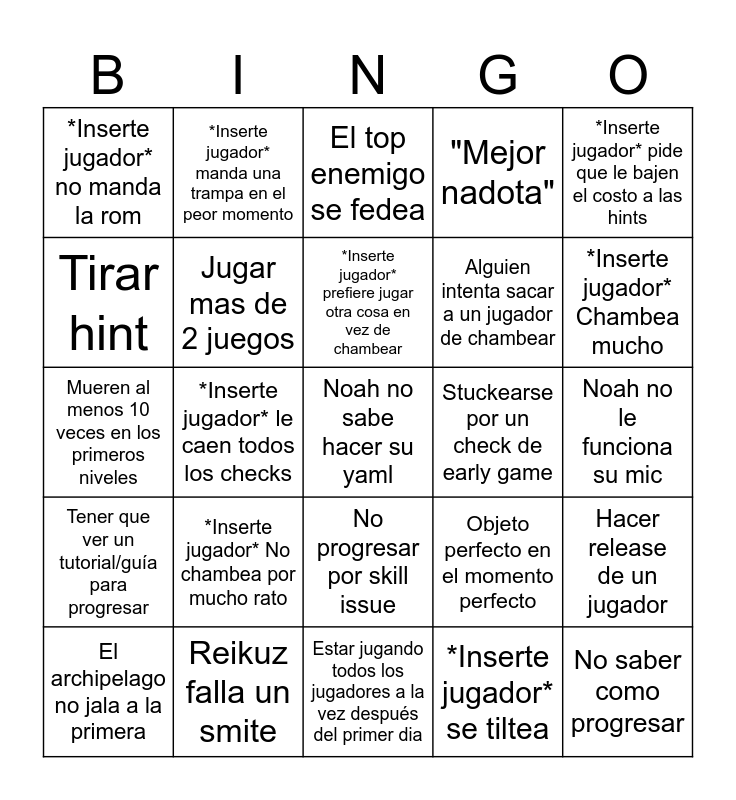 This bingo card has a free space and 24 words: *Inserte jugador* No chambea por mucho rato, Reikuz falla un smite, *Inserte jugador* prefiere jugar otra cosa en vez de chambear, El archipelago no jala a la primera, *Inserte jugador* pide que le bajen el costo a las hints, *Inserte jugador* no manda la rom, Tirar hint, *Inserte jugador* manda una trampa en el peor momento, Stuckearse por un check de early game, No progresar por skill issue, Alguien intenta sacar a un jugador de chambear, Mueren al menos 10 veces en los primeros niveles, Objeto perfecto en el momento perfecto, Hacer release de un jugador, Jugar mas de 2 juegos, *Inserte jugador* se tiltea, Noah no le funciona su mic, El top enemigo se fedea, *Inserte jugador* Chambea mucho, *Inserte jugador* le caen todos los checks, No saber como progresar, Tener que ver un tutorial/guía para progresar, "Mejor nadota" and Estar jugando todos los jugadores a la vez después del primer dia.