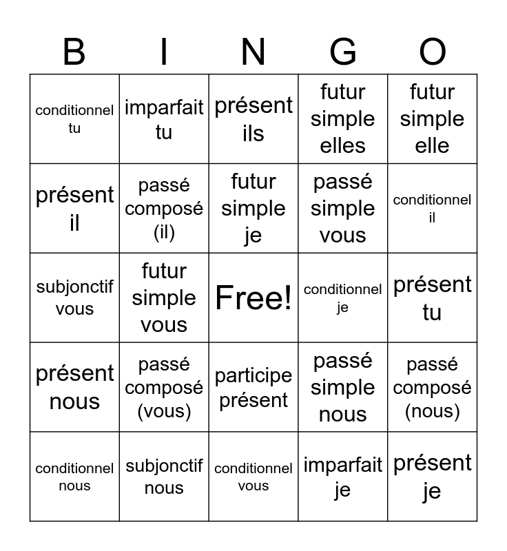 This bingo card has a free space and 37 words: passé composé (je), passé composé (tu), passé composé (ils), passé composé (il), passé composé (nous), passé composé (vous), futur simple je, futur simple tu, futur simple elle, futur simple nous, futur simple vous, futur simple elles, présent je, présent tu, présent il, présent nous, présent vous, présent ils, participe présent, conditionnel je, conditionnel tu, conditionnel il, conditionnel nous, conditionnel vous, conditionnel ils, imparfait je, imparfait tu, imparfait elle, subjonctif je, subjonctif tu, subjonctif il, subjonctif nous, subjonctif vous, subjonctif ils, passé simple nous, passé simple vous and passé simple ils.