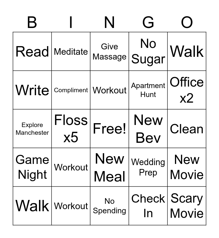 This bingo card has a free space and 24 words: Workout, Workout, Workout, Walk, Walk, Read, Write, Meditate, New Bev, New Meal, Apartment Hunt, Explore Manchester, Wedding Prep, New Movie, Compliment, Check In, Clean, Give Massage, Office x2, Floss x5, Scary Movie, Game Night, No Sugar and No Spending.