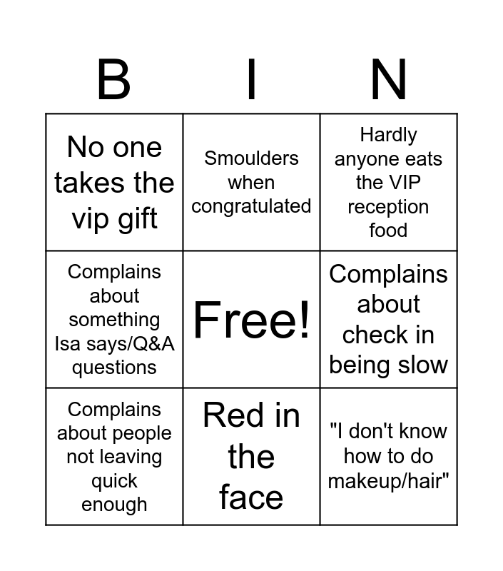 This bingo card has a free space and 10 words: Red in the face, Hardly anyone eats the VIP reception food, No one takes the vip gift, "I don't know how to do makeup/hair", Complains about something Isa says/Q&A questions, Complains about people not leaving quick enough, Smoulders when congratulated, Complains about check in, Complains about check in being slow and Comp;.