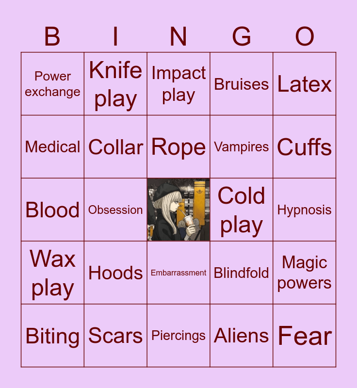 This bingo card has a free space and 28 words: Magic powers, Pet play, Vampires, Aliens, Medical, Impact play, Knife play, Wax play, Cold play, Biting, Blood, Bruises, Scars, Piercings, Cuffs, Gags, Hoods, Collar, Rope, Embarrassment, Power exchange, Corruption, Fear, Obsession, Hypnosis, Blindfold, Latex and Leather.