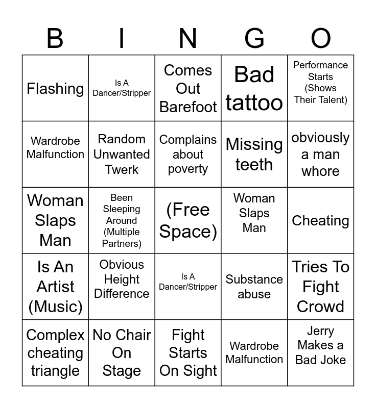 This bingo card has a free space and 39 words: Surprise ring/ engaged, Twerk off, Surprise, shes a he, Random Unwanted Twerk, Complex cheating triangle, Is A Dancer/Stripper, Complains about poverty, Bad Fits, Performance Starts (Shows Their Talent), Is An Artist (Music), Been Sleeping Around (Multiple Partners), Bad tattoo, Jerry Makes a Bad Joke, Cheating, Woman Slaps Man, Obvious Height Difference, Cheating with Relative, Flashing, Comes Out Barefoot, Substance abuse, Wardrobe Malfunction, Fight Starts On Sight, Missing teeth, obviously a man whore, Random Unwanted Twerk, Is An Artist (Music), Performance Starts (Shows Their Talent), Bad Fits, Been Sleeping Around (Multiple Partners), Is A Dancer/Stripper, Jerry Makes a Bad Joke, Obvious Height Difference, Comes Out Barefoot, No Chair On Stage, Wardrobe Malfunction, Someone holding Cake/Prop, Tries To Fight Crowd, Woman Slaps Man and Fight Starts On Sight.