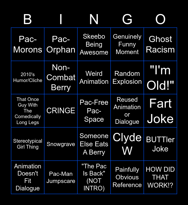 This bingo card has a free space and 35 words: "Yellow One", SIMPinky, EUGH, Non-Combat Berry, Someone Else Eats A Berry, Genuinely Funny Moment, 2010's Humor/Cliche, Ghost Gore, Weird Animation, Pac-Suffix, That Once Guy With The Comedically Long Legs, Ghost Racism, Pac-Man Eated It All :(, Excessive SFX, Pac-Morons, Reused Animation or Dialogue, Painfully Obvious Reference, CRINGE, Stereotypical Girl Thing, HOW DID THAT WORK!?, Clyde W, Animation Doesn't Fit Dialogue, BUTTler Joke, Pac-Man Jumpscare, Skeebo Being Awesome, "I'm Old!", They Got Fat, Football Head Guy, Random Explosion, Fart Joke, Writer's Kink, "The Pac Is Back" (NOT INTRO), Snowgrave, Pac-Orphan and Obvious Moral Moment.