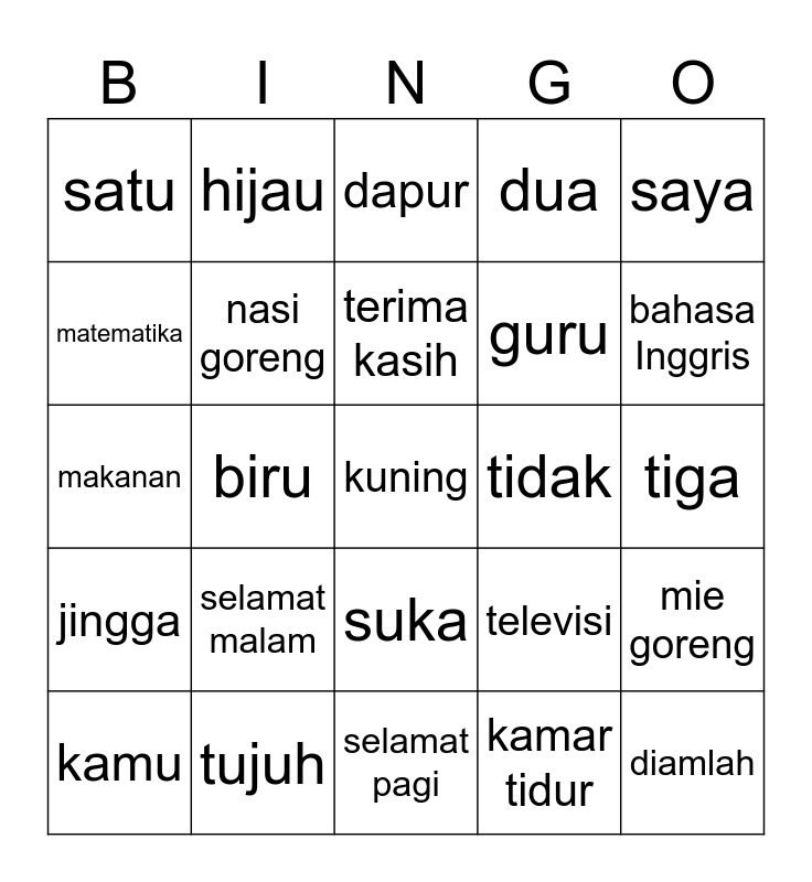 This bingo card has 30 words: tujuh, rumah, biru, merah, satu, dapur, nasi goreng, suka, tidak, selamat pagi, tiga, kuning, kamar tidur, diamlah, bahasa Inggris, penjas, televisi, jingga, selamat malam, saya, makanan, sepuluh, hijau, guru, matematika, dua, mie goreng, kamu, terima kasih and duduklah.