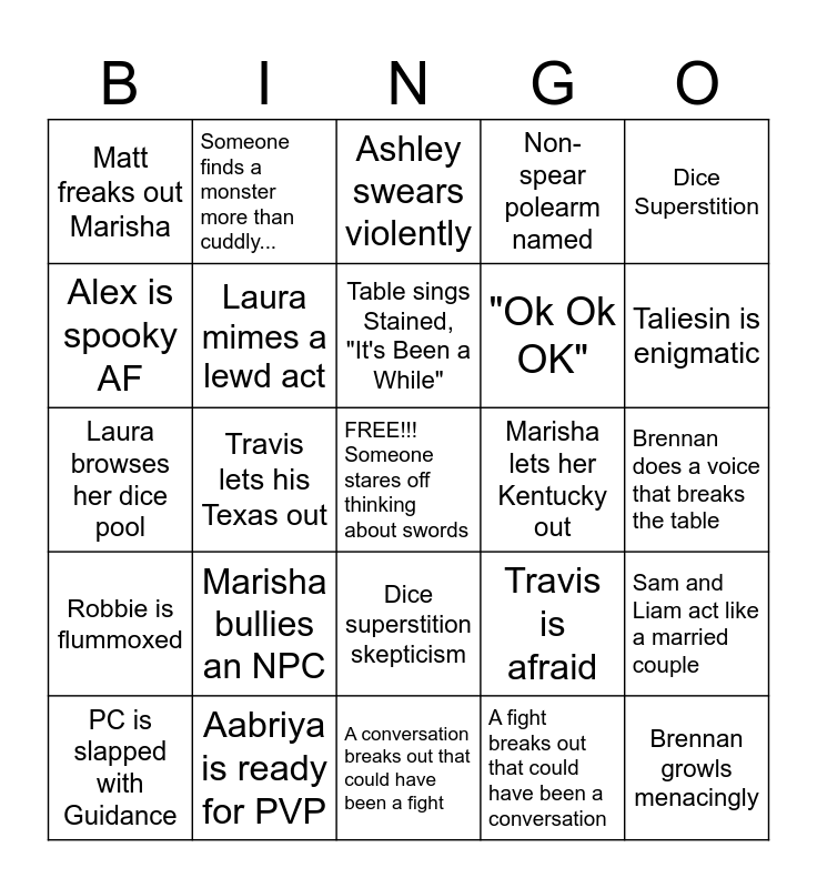 This bingo card has a free space and 24 words: Marisha bullies an NPC, Aabriya is ready for PVP, Table sings Stained, "It's Been a While", PC is slapped with Guidance, Dice Superstition, Matt freaks out Marisha, Alex is spooky AF, Someone finds a monster more than cuddly..., Marisha lets her Kentucky out, Dice superstition skepticism, "Ok Ok OK", Laura browses her dice pool, Travis is afraid, Sam and Liam act like a married couple, Laura mimes a lewd act, A fight breaks out that could have been a conversation, Brennan does a voice that breaks the table, Ashley swears violently, Taliesin is enigmatic, Travis lets his Texas out, Brennan growls menacingly, Robbie is flummoxed, Non-spear polearm named and A conversation breaks out that could have been a fight.