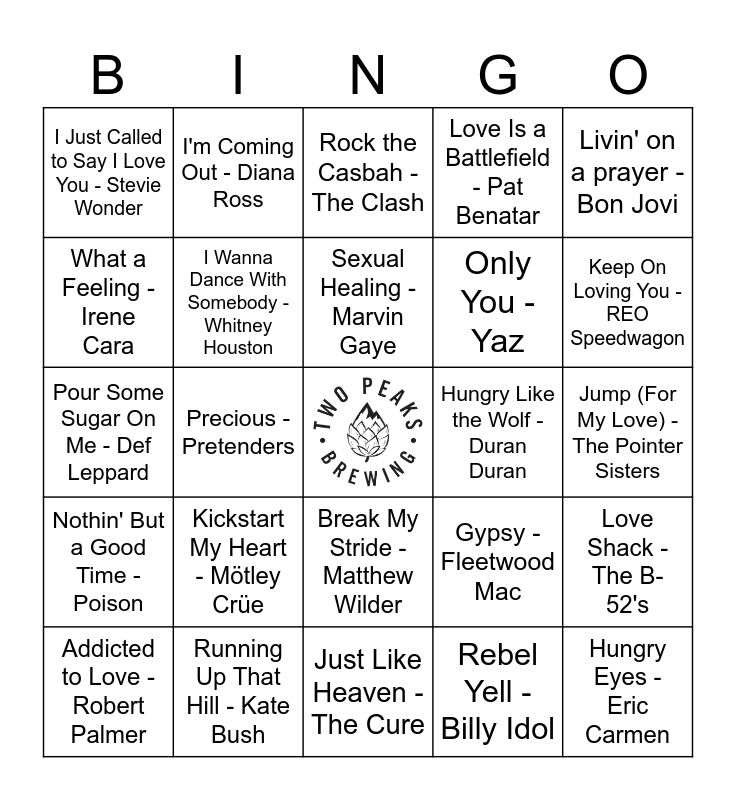 This bingo card has a free space and 70 words: I Ran - A Flock of Seagulls, Mony Mony - Billy Idol, In the Air Tonight - Phil Collins, Smooth Operator - Sade, Keep On Loving You - REO Speedwagon, Drive - The Cars, I Wanna Dance With Somebody - Whitney Houston, Faith - George Michael, Only You - Yaz, Rock With You - Michael Jackson, Pour Some Sugar On Me - Def Leppard, Sweet Child O' Mine - Guns N' Roses, Love Is a Battlefield - Pat Benatar, Livin' on a prayer - Bon Jovi, Blue Monday - New Order, Running Up That Hill - Kate Bush, Just Like Heaven - The Cure, Hungry Like the Wolf - Duran Duran, Personal Jesus - Depeche Mode, What a Feeling - Irene Cara, Girls On Film - Duran Duran, Break My Stride - Matthew Wilder, Gypsy - Fleetwood Mac, Love Shack - The B-52's, Life Is a Highway - Tom Cochrane, Heat of the Moment - Asia, I Melt With You - Modern English, Kiss - Prince & The Revolution, Jump (For My Love) - The Pointer Sisters, Walk Like an Egyptian - The Bangles, I'm Coming Out - Diana Ross, It Takes Two - Rob Base & DJ EZ Rock, Raspberry Beret - Prince & The Revolution, Rock 'N' Roll High School - Ramones, I'm On Fire - Bruce Springsteen, Listen To Your Heart - Roxette, Bette Davis Eyes - Kim Carnes, Love Me Tomorrow - Chicago, Hungry Eyes - Eric Carmen, I Just Called to Say I Love You - Stevie Wonder, Bad to the Bone - George Thorogood & The Destroyers, Sexual Healing - Marvin Gaye, Rebel Yell - Billy Idol, Fight for Your Right - Beastie Boys, Love Will Tear Us Apart - Joy Division, Precious - Pretenders, Working for the Weekend - Loverboy, Happy Head - The Mighty Lemon Drops, I Want to Know What Love Is - Foreigner, Heaven - Bryan Adams, Another Brick In the Wall, Pt. 2 - Pink Floyd, Real Wild Child (Wild One) - Iggy Pop, Alone - Heart, Don't Dream It's Over - Crowded House, Nothin' But a Good Time - Poison, Here I Go Again - Whitesnake, Rock the Casbah - The Clash, Paradise City - Guns N' Roses, Juke Box Hero - Foreigner, Addicted to Love - Robert Palmer, Kickstart My Heart - MΓΆtley CrΓΌe, Misunderstanding - Genesis, Don't Stop Believin' - Journey, Summer of 69 - Bryan Adams, I Won't Back Down - Tom Petty, Sharp Dressed Man - ZZ Top, Eye of the Tiger - Survivor, We Didn't Start the Fire - Billy Joel, C*m On Feel the Noize - Quiet Riot and You're a Strange Animal - Gowan.
