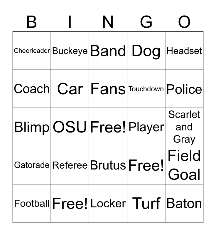 This bingo card has a free space and 25 words: Referee, Locker, Fans, Football, Headset, Cheerleader, Coach, Buckeye, Player, Brutus, Touchdown, Blimp, Free!, Field Goal, Car, Drum Major, Scarlet and Gray, Band, Police, OSU, Baton, Free!, Gatorade, Dog and Turf.