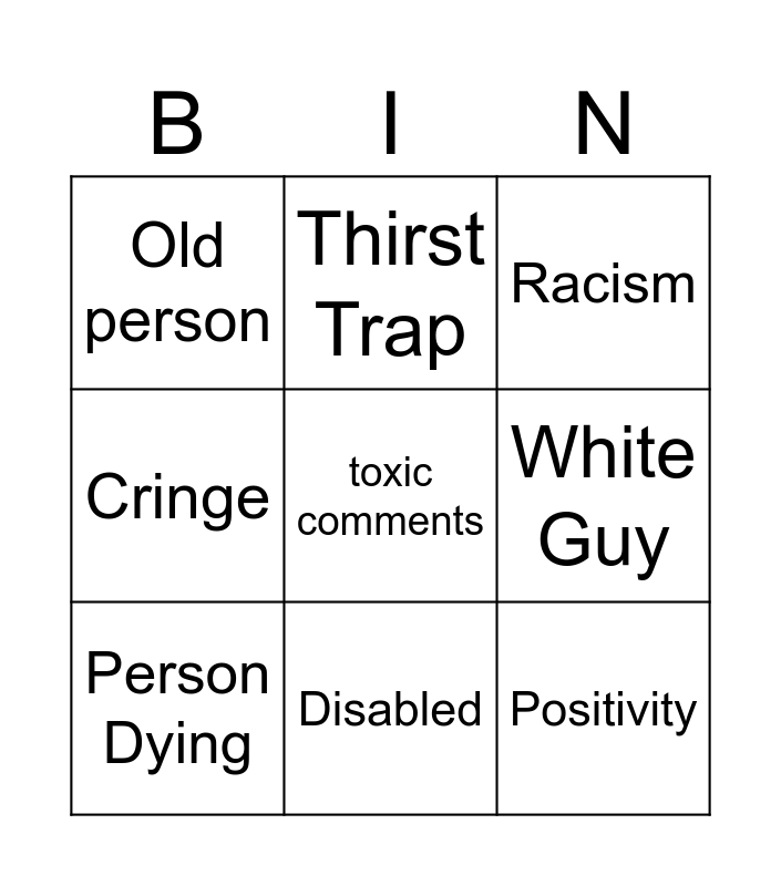 This bingo card has a free space and 9 words: Person Dying, Racism, Thirst Trap, Cringe, Old person, White Guy, Positivity, Sports related and Disabled.
