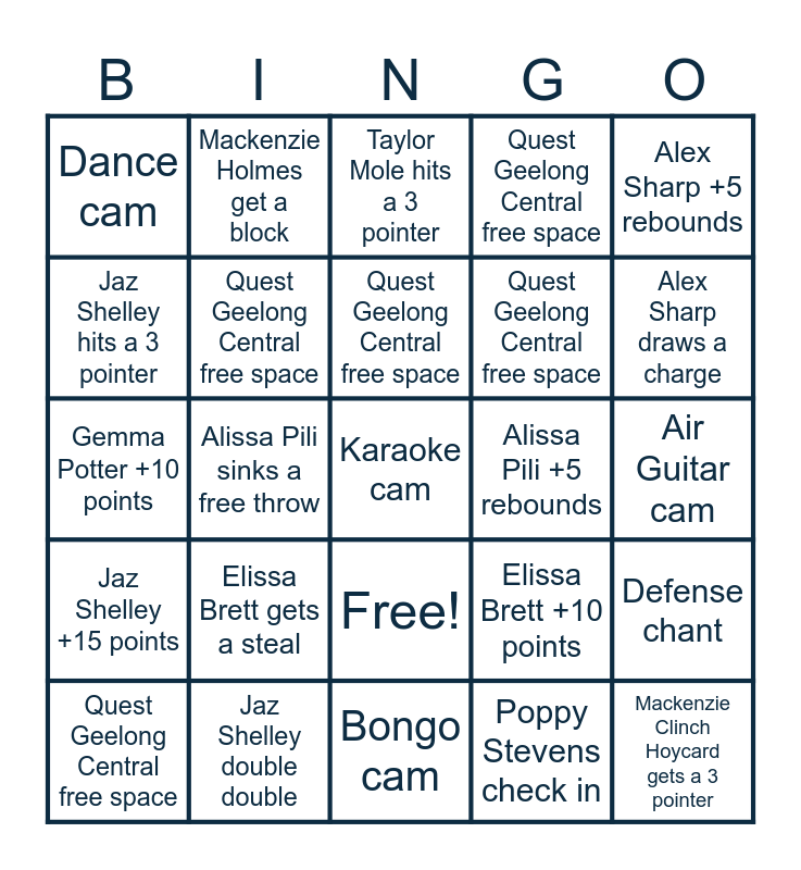 This bingo card has 26 words: Free!, Poppy Stevens check in, Quest Geelong Central free space, Jaz Shelley double double, Alex Sharp +5 rebounds, Dance cam, Jaz Shelley hits a 3 pointer, Mackenzie Holmes get a block, Air Guitar cam, Elissa Brett +10 points, Quest Geelong Central free space, Gemma Potter +10 points, Defense chant, Quest Geelong Central free space, Alissa Pili sinks a free throw, Lilly Rotunno gets a steal, Quest Geelong Central free space, Jaz Shelley +15 points, Taylor Mole hits a 3 pointer, Karaoke cam, Alex Sharp draws a charge, Bongo cam, Alissa Pili +5 rebounds, Elissa Brett gets a steal, Quest Geelong Central free space and Mackenzie Clinch Hoycard gets a 3 pointer.