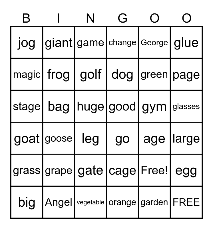 This bingo card has 37 words: Free!, cage, garden, magic, goose, gym, frog, orange, George, big, page, change, stage, huge, glue, good, grape, game, glasses, bag, jog, dog, leg, age, Angel, large, giant, vegetable, egg, gate, gift, go, green, grass, goat, golf and FREE.