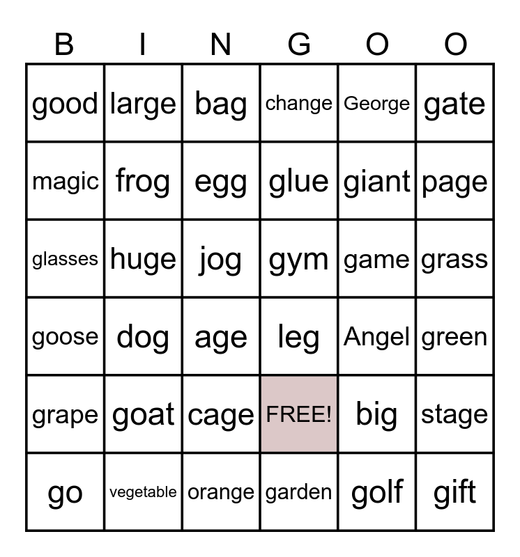 This bingo card has 36 words: FREE!, cage, garden, magic, goose, gym, frog, orange, George, big, page, change, stage, huge, glue, good, grape, game, glasses, bag, jog, dog, leg, age, Angel, large, giant, vegetable, egg, gate, gift, go, green, grass, goat and golf.