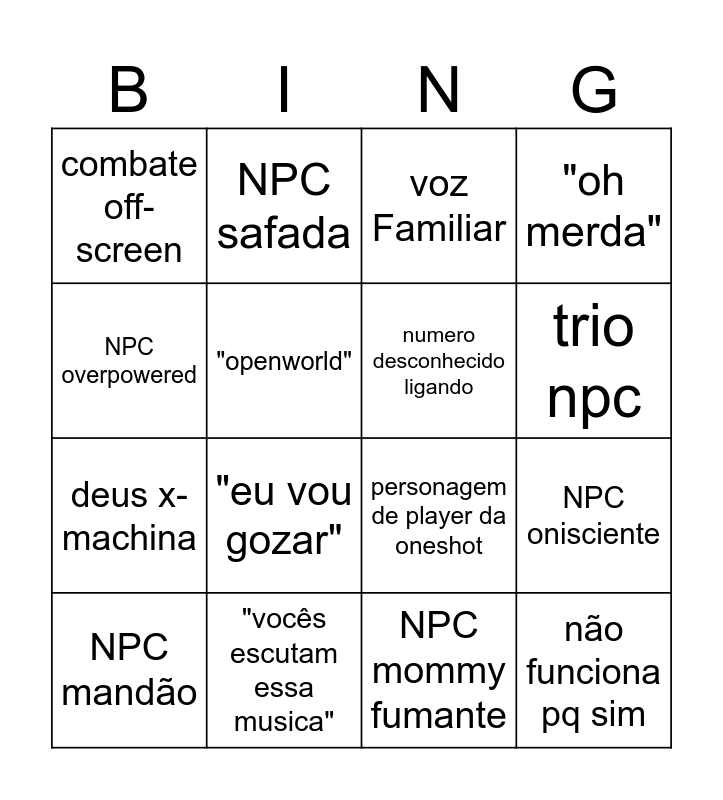 This bingo card has 16 words: "vocês escutam essa musica", NPC onisciente, voz Familiar, combate off-screen, deus x-machina, NPC safada, personagem de player da oneshot, NPC mommy fumante, NPC overpowered, "openworld", NPC mandão, "oh merda", "eu vou gozar", trio npc, numero desconhecido ligando and não funciona pq sim.