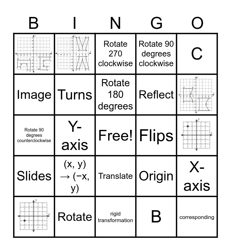 This bingo card has 5 images, a free space and 19 words: (x, y) → (−x, y), Rotate, Rotate 180 degrees, C, Image, Flips, Translate, Reflect, Rotate 90 degrees counterclockwise, Origin, X-axis, Turns, B, Rotate 270 clockwise, Y-axis, corresponding, Slides, Rotate 90 degrees clockwise and rigid transformation.
