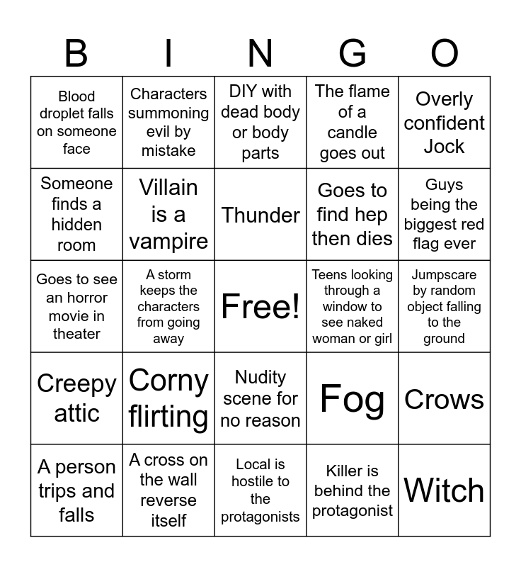 This bingo card has a free space and 24 words: Corny flirting, A cross on the wall reverse itself, Thunder, A person trips and falls, Overly confident Jock, Blood droplet falls on someone face, Someone finds a hidden room, Characters summoning evil by mistake, Teens looking through a window to see naked woman or girl, Nudity scene for no reason, Goes to find hep then dies, Goes to see an horror movie in theater, Fog, Crows, Villain is a vampire, Killer is behind the protagonist, Jumpscare by random object falling to the ground, DIY with dead body or body parts, Guys being the biggest red flag ever, A storm keeps the characters from going away, Witch, Creepy attic, The flame of a candle goes out and Local is hostile to the protagonists.