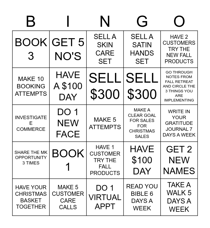 This bingo card has a free space and 24 words: BOOK 1, MAKE 5 CUSTOMER CARE CALLS, SELL $300, HAVE YOUR CHRISTMAS BASKET TOGETHER, HAVE 2 CUSTOMERS TRY THE NEW FALL PRODUCTS, BOOK 3, MAKE 10 BOOKING ATTEMPTS, GET 5 NO'S, MAKE A CLEAR GOAL FOR SALES FOR CHRISTMAS SALES, HAVE 1 CUSTOMER TRY THE FALL PRODUCTS, SELL $300, INVESTIGATE E COMMERCE, HAVE $100 DAY, GET 2 NEW NAMES, HAVE A $100 DAY, READ YOU BIBLE 6 DAYS A WEEK, WRITE IN YOUR GRATITUDE JOURNAL 7 DAYS A WEEK, SELL A SKIN CARE SET, GO THROUGH NOTES FROM FALL RETREAT AND CIRCLE THE 3 THINGS YOU ARE IMPLEMENTING, DO 1 NEW FACE, TAKE A WALK 5 DAYS A WEEK, SHARE THE MK OPPORTUNITY 3 TIMES, SELL A SATIN HANDS SET and DO 1 VIRTUAL APPT.