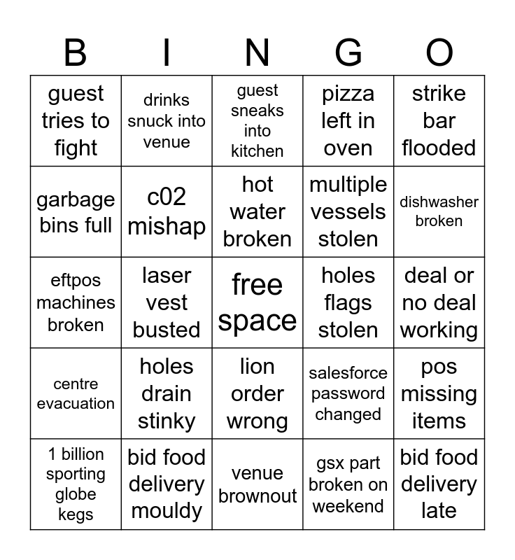 This bingo card has a free space and 24 words: holes drain stinky, bid food delivery mouldy, hot water broken, 1 billion sporting globe kegs, strike bar flooded, guest tries to fight, garbage bins full, drinks snuck into venue, holes flags stolen, lion order wrong, multiple vessels stolen, eftpos machines broken, salesforce password changed, pos missing items, c02 mishap, gsx part broken on weekend, deal or no deal working, guest sneaks into kitchen, dishwasher broken, laser vest busted, bid food delivery late, centre evacuation, pizza left in oven and venue brownout.