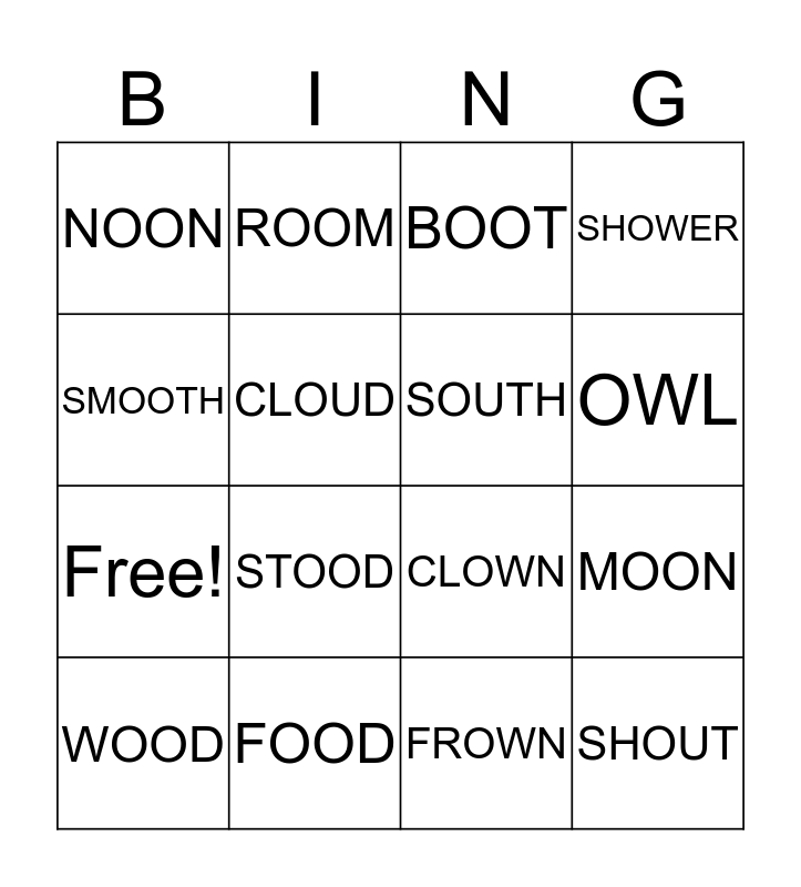 This bingo card has 20 words: MOON, COOK, BOOT, POOL, WOOD, SMOOTH, FOOD, NOON, Free!, ROOM, STOOD, CLOWN, CLOUD, SHOUT, SOUTH, COW, OWL, SHOWER, FROWN and FLOWER.