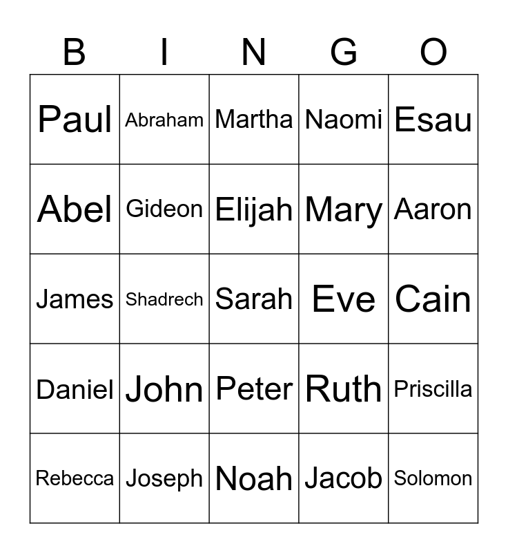 This bingo card has a free space and 39 words: Jesus, Moses, Joshua, Ruth, Priscilla, Daniel, Shadrech, Adam, Eve, Cain, Abel, Abraham, Benjamin, Aaron, James, John, Peter, Naomi, Andrew, Rebecca, Gideon, Elijah, Jacob, Esau, Hannah, Joseph, Noah, Samson, Levi, Paul, Saul, Silas, Mary, Solomon, Simon, Leah, Martha, Delilah and Elizabeth.