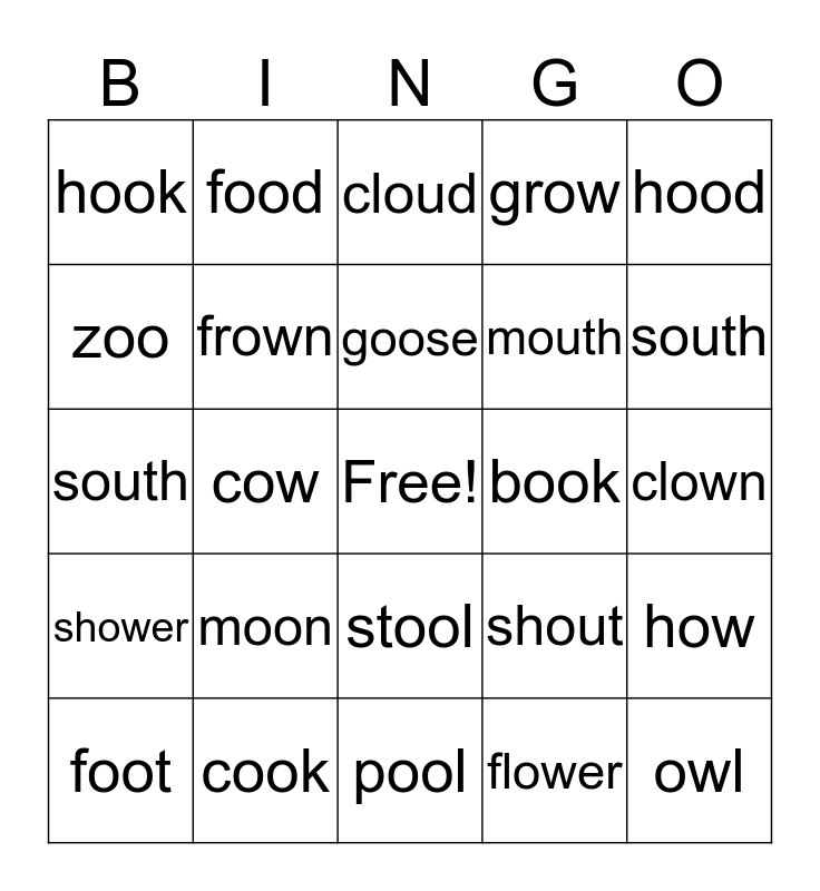 This bingo card has a free space and 24 words: moon, cook, goose, foot, hood, hook, zoo, food, book, stool, mouth, south, shout, how, frown, flower, clown, cloud, south, cow, owl, shower, grow and pool.