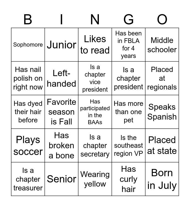 This bingo card has 25 words: Has broken a bone, Wearing yellow, Is a chapter vice president, Is a chapter treasurer, Middle schooler, Sophomore, Has nail polish on right now, Junior, Has more than one pet, Is a chapter secretary, Is a chapter president, Has dyed their hair before, Is the southeast region VP, Placed at state, Left-handed, Born in July, Speaks Spanish, Likes to read, Placed at regionals, Favorite season is Fall, Has participated in the BAAs, Senior, Plays soccer, Has been in FBLA for 4 years and Has curly hair.