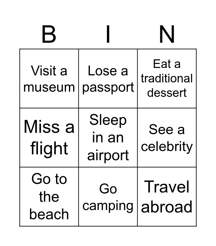 This bingo card has 9 words: Go to the beach, Eat a traditional dessert, Lose a passport, Miss a flight, Visit a museum, See a celebrity, Sleep in an airport, Travel abroad and Go camping.
