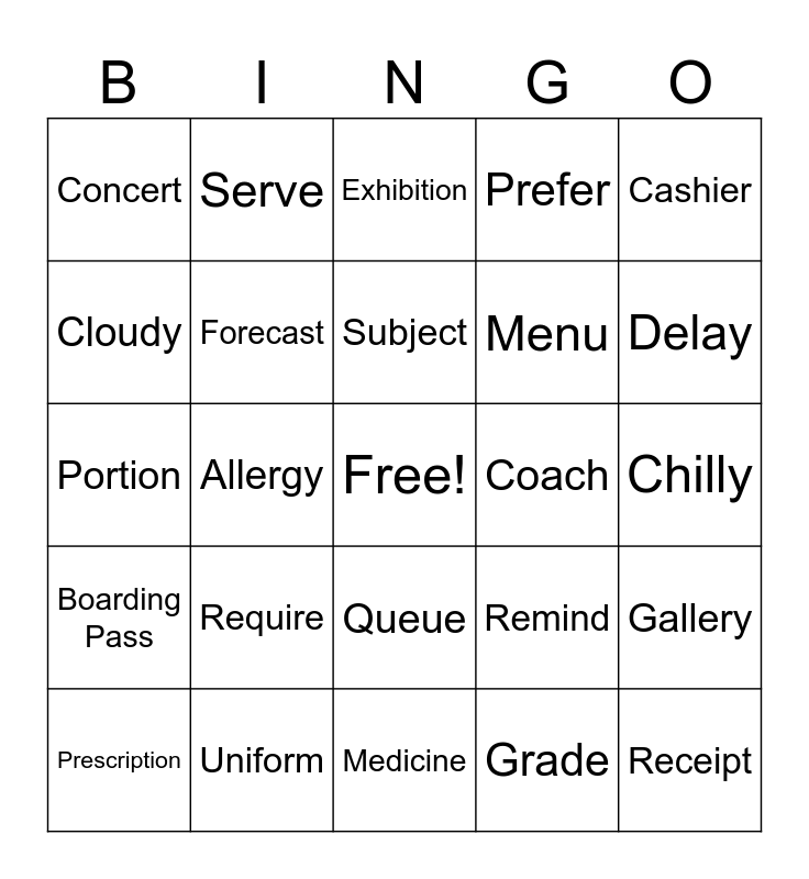 This bingo card has a free space and 36 words: Ingredients, Improve, Appointment, Forecast, Remind, Boarding Pass, Subject, Luggage, Cashier, Temperature, Allergy, Prefer, Avoid, Coach, Delay, Concert, Ticket, Require, Receipt, Exhibition, Chilly, Gallery, Uniform, Prescription, Medicine, Serve, Portion, Order, Menu, Cloudy, Thunderstorm, Departure, Grade, Queue, Discount and Refund.