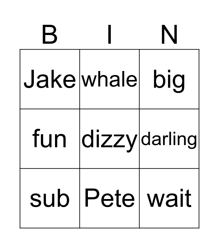 This bingo card has a free space and 8 words: darling, big, whale, sub, Jake, wait, fun and Pete.